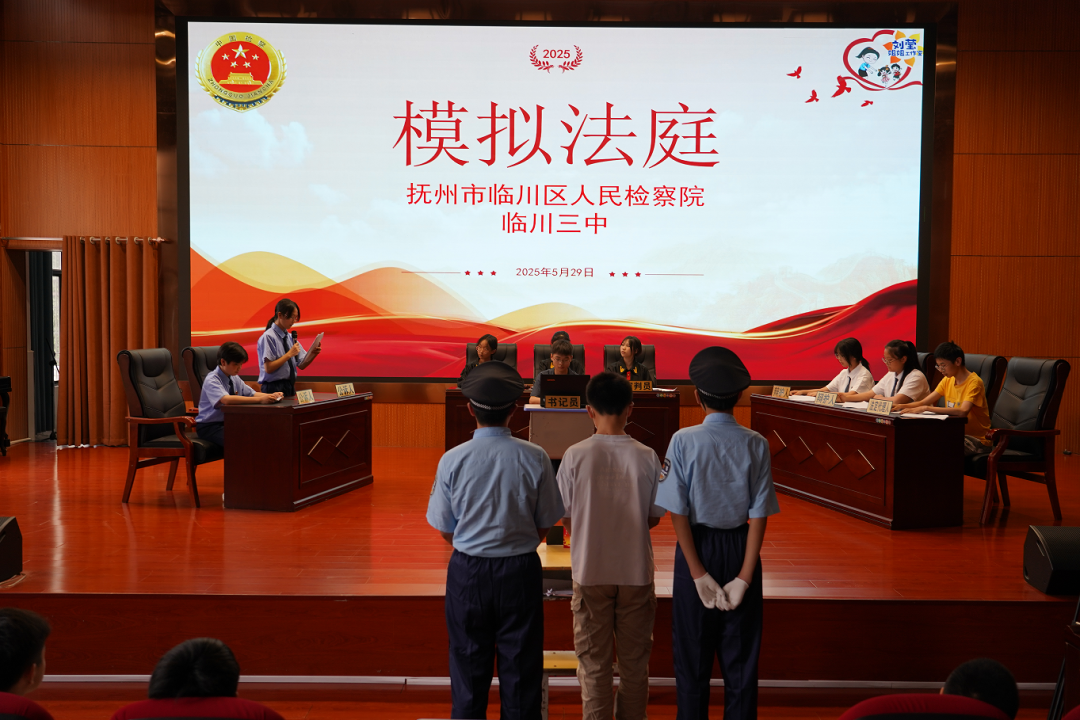 随着一声清脆的法槌敲响,临川三中礼堂内三百余名学生瞬间屏息凝神。5月29日,临川区人民检察院联合临川三中开展模拟法庭活动,身着法袍、检察制服的中学生“演员”们将法治教育课堂搬上舞台,为同龄人带来一堂直击心灵的法治实践课。